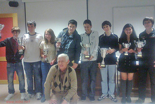 ¡CAMPEONES! De izda a derecha los premiados: Alejandro, Xabier, Irati, Ostolozaga, Luis David, Marchena, Cristina, Dani. |